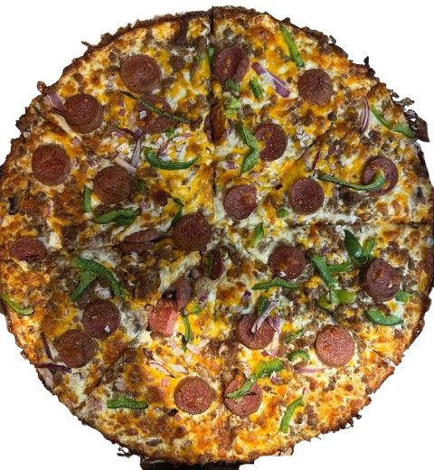 Smoky BBQ and Neapolitan pizza sauce, mozzarella, chicken breast, cheddar, mushrooms, green onions & bell peppers.