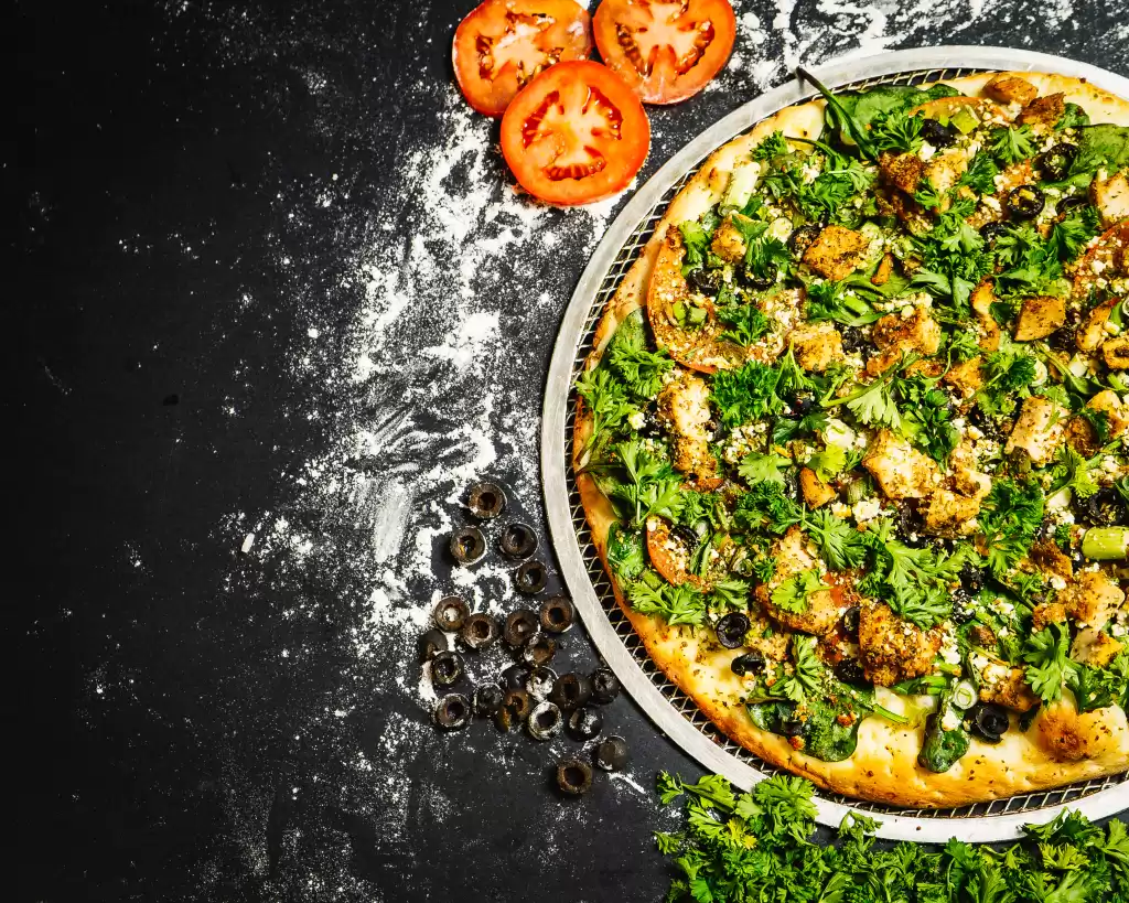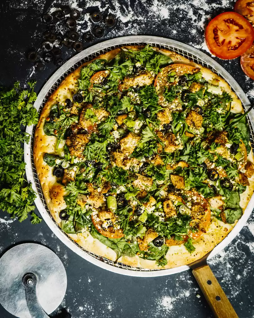 No mozzarella. Olive oil, spinach, tomatoes, feta, chicken, Parmesan, green onions, black olives, olive oil, garlic & parsley.