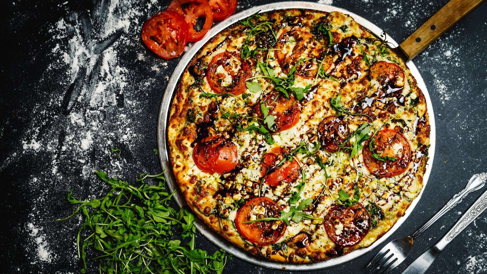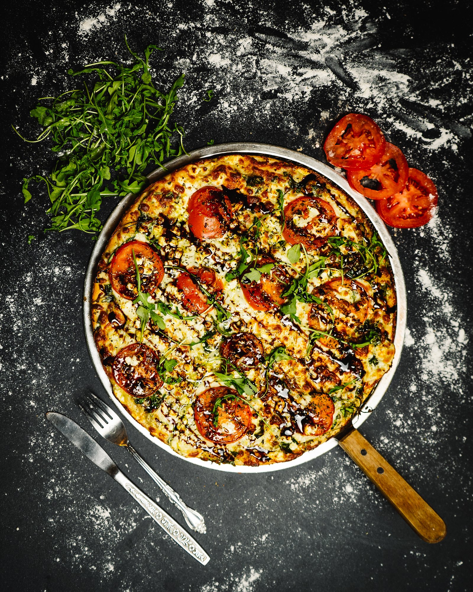 Pesto, fresh arugula, mozzarella, goat cheese, sliced tomatoes, herbs, garlic olive oil & balsamic reduction.