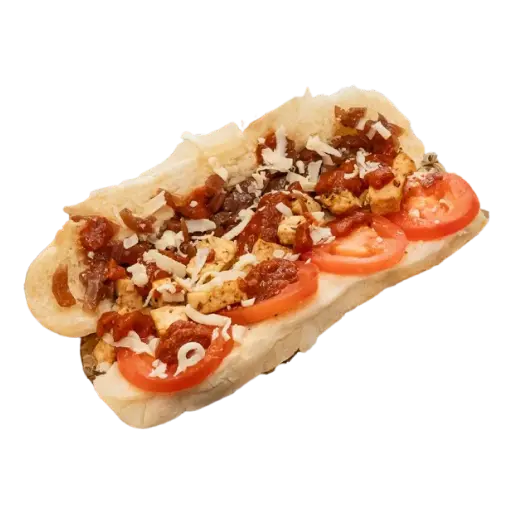 Chicken breast topped with red sauce, caramelized onion, Parmesan, mozzarella and Roma tomatoes, on garlic toasted sub bun.