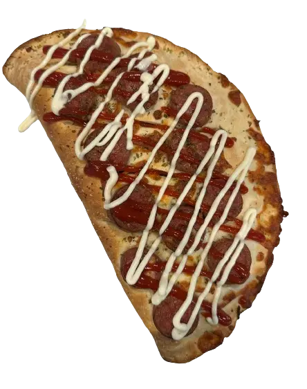 Mixed jambon, mushrooms, green pepper, mozzarella, beef sausage on top, mayo, and ketchup