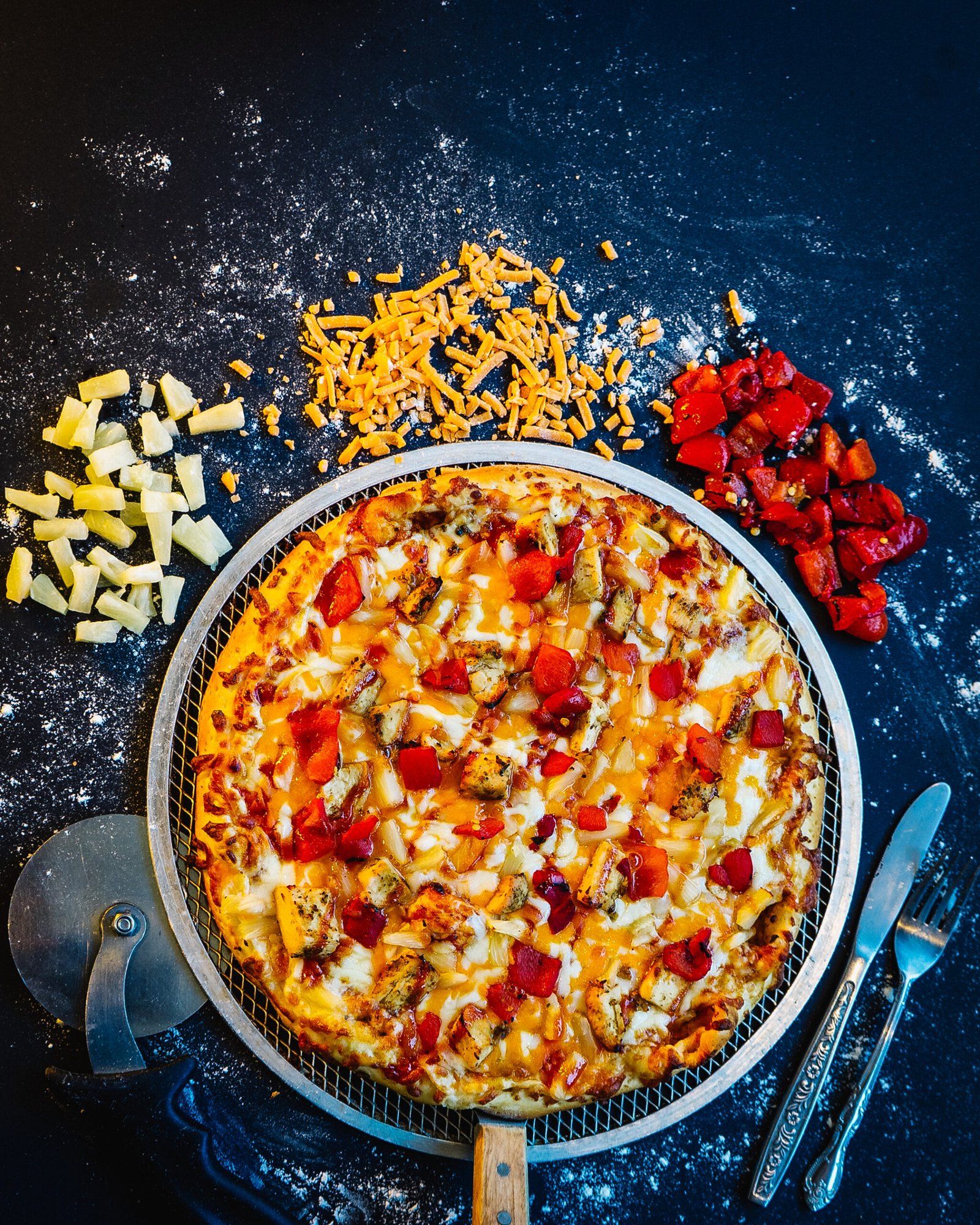 eet BBQ sauce and neopolitan sauce, mozzarella, chicken, cheddar, pineapple & roasted peppersย