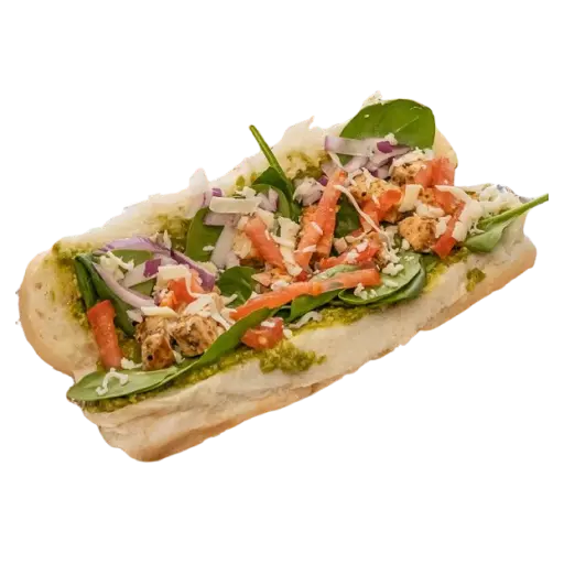 Pesto sauce, oven roasted chicken breast, tomatoes, red onions, mozzarella, parmesan, and spinach.