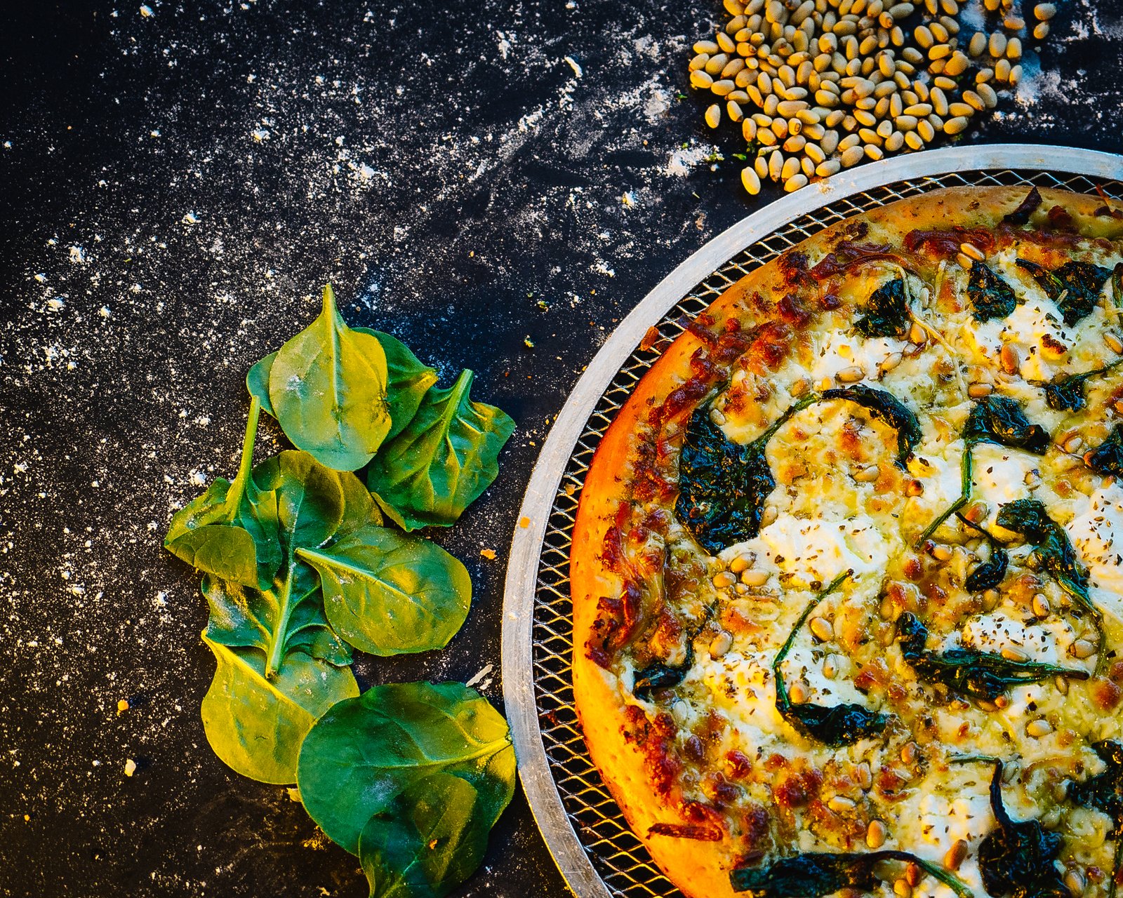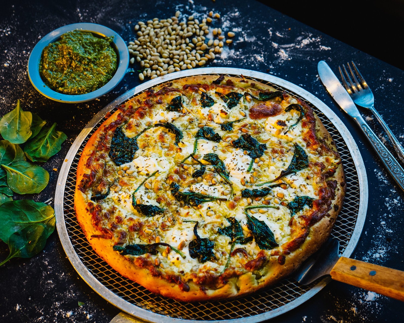 Pesto sauce, mozzarella, sautΓ©ed spinach, fresh garlic, Parmigianino, pine nuts, basil & ricotta.